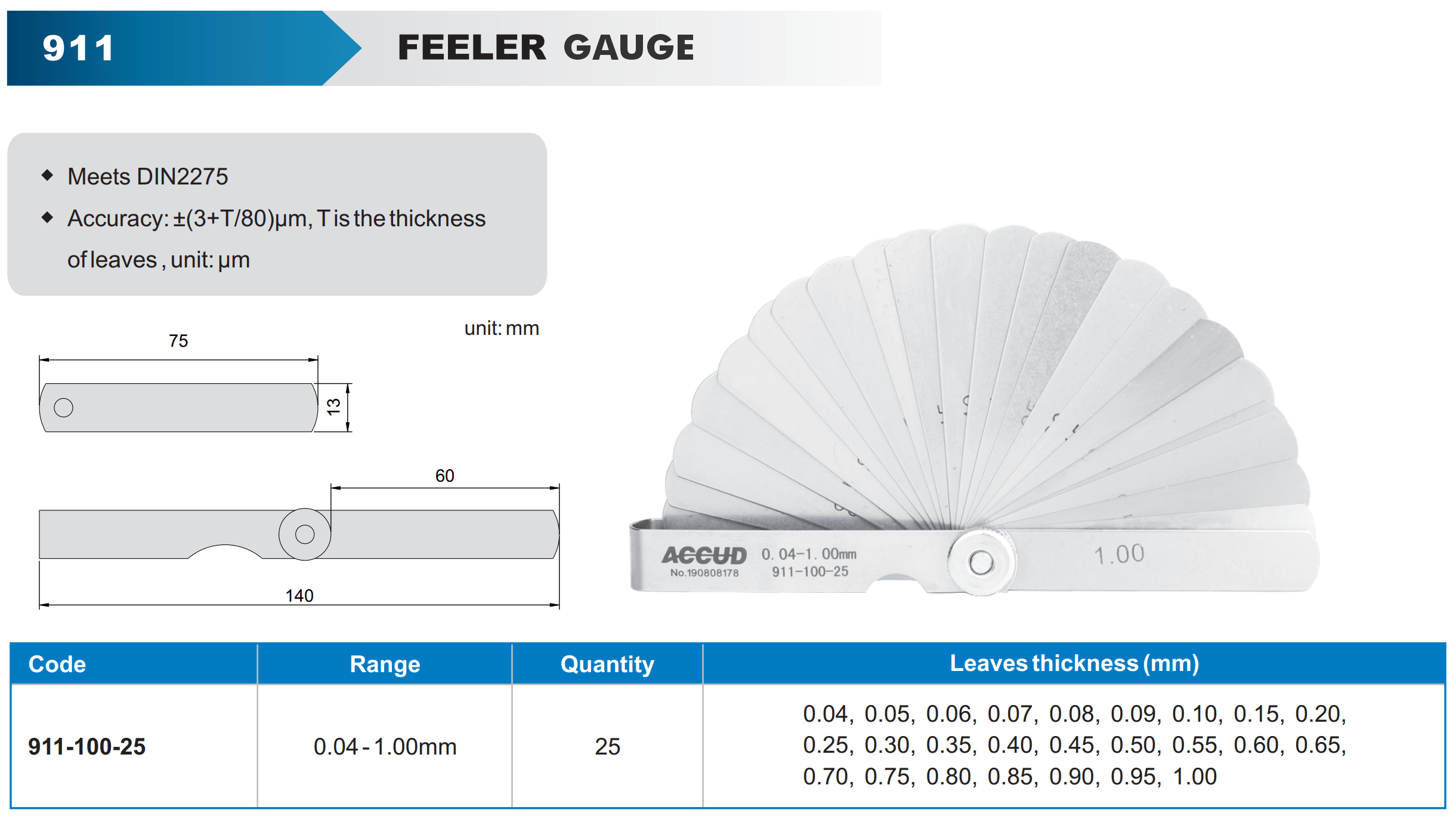 • Varied Thickness: Each blade in a feeler gauge set is of a different thickness, usually measured in thousandths of an inch (imperial) or hundredths of a millimeter (metric). Common thicknesses range from 0.001 inches (0.03 mm) to 0.040 inches (1.00 mm).
