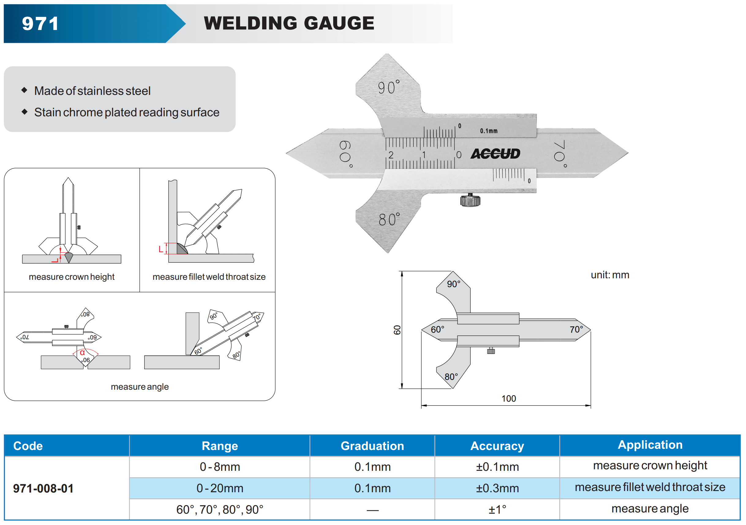• Angle Measurement: Some gauges are equipped to measure the angle of the weld, ensuring it conforms to design requirements.