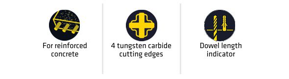 SDS-plus high performance drill bit with 4 tungsten carbide cutting edges and new progressive spiral design with dowel length indicator. Problem-free drilling in reinforced concrete, vibrationless running and fast removal of drilling dust