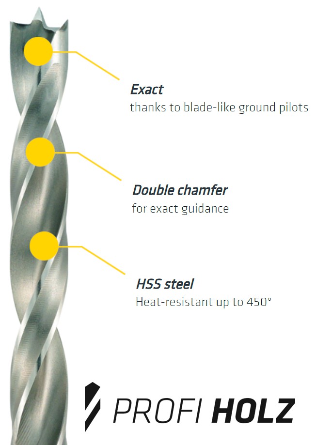Heat resistant up to 450˚C. For drilling in soft and hard wood, in chipboards, fibreboards, for drilling dowel holes.