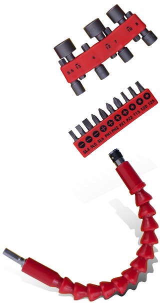 The bits and the nutsetters have 6.35mm hex drive that fits in the supplied 250mm flexible shaft. Bend the shaft to reach a bolt or screw a normal screwdriver won't.
