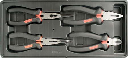 Insert for tool our tool cabinets. 1/3 drawer size, 34 pieces. The set includes combination pliers, long nose pliers, side cutters and bent nose pliers. High-quality chrome vanadium steel and non-slip coated grips guarantee high quality and comfort of work.