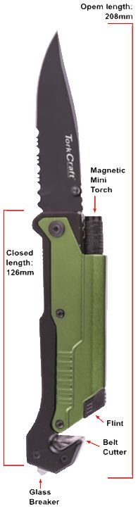 Knife Survival Green With Led Light & Fire Starter In Double Blister
